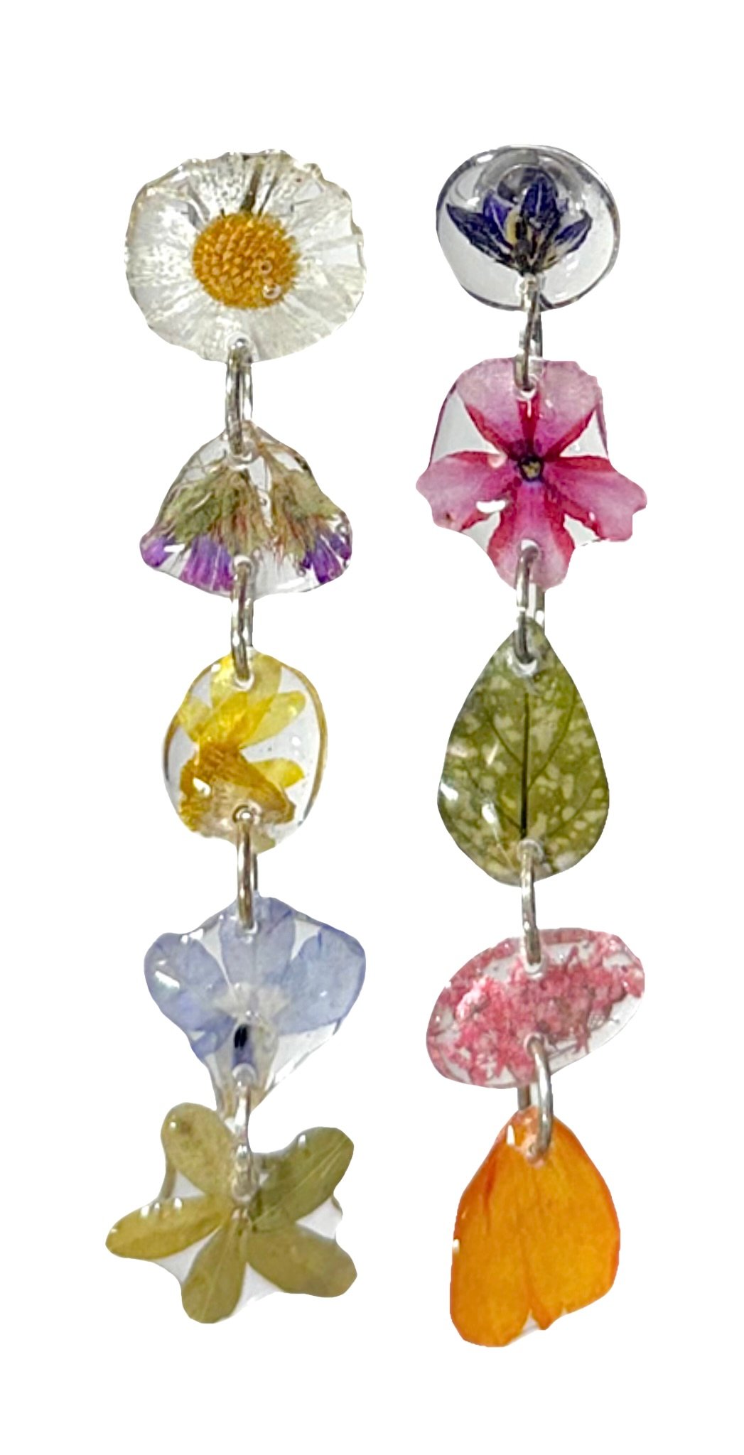 an arrangement of flowers, petals, and foliage from my garden arranged in a straight long drop shape. a mishmash of color and whimsy. extremely lightweight. hardware is silver plated/gold plated stainless steel