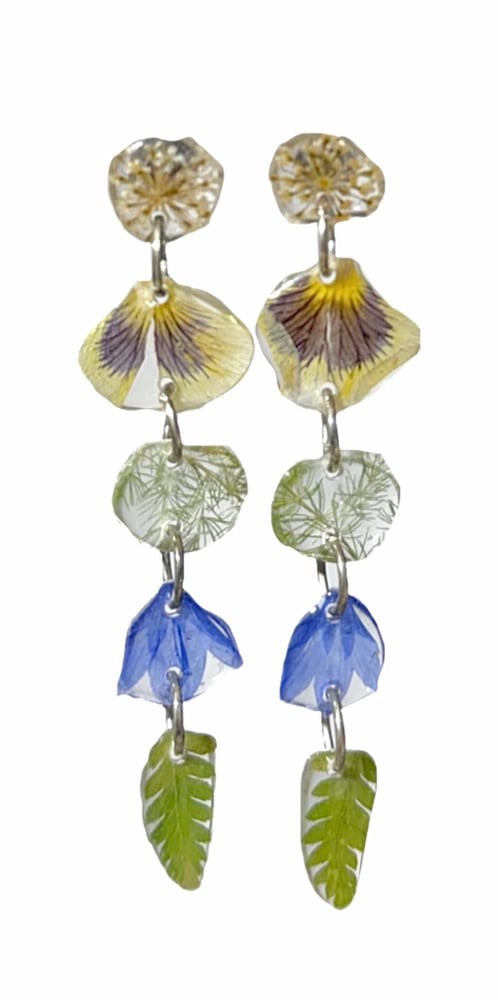 an arrangement of flowers, petals, and foliage from my garden arranged in a straight long drop shape. a mishmash of color and whimsy. extremely lightweight. hardware is silver plated/gold plated stainless steel