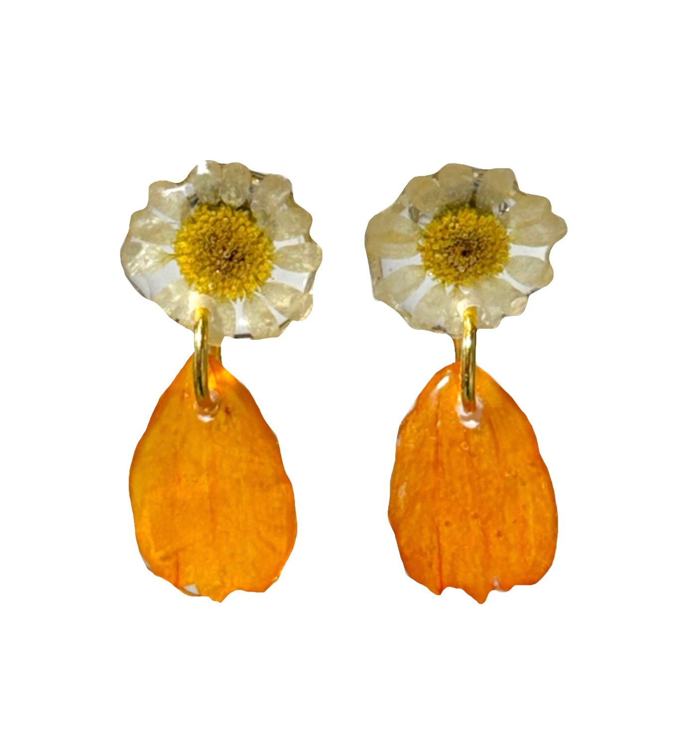 flowers, petals, and foliage from my garden paired up into symmetrical small earrings. top flower sits on earlobe, bottom flower slightly dangles. extremely lightweight. hardware silver plated/gold plated stainless steel