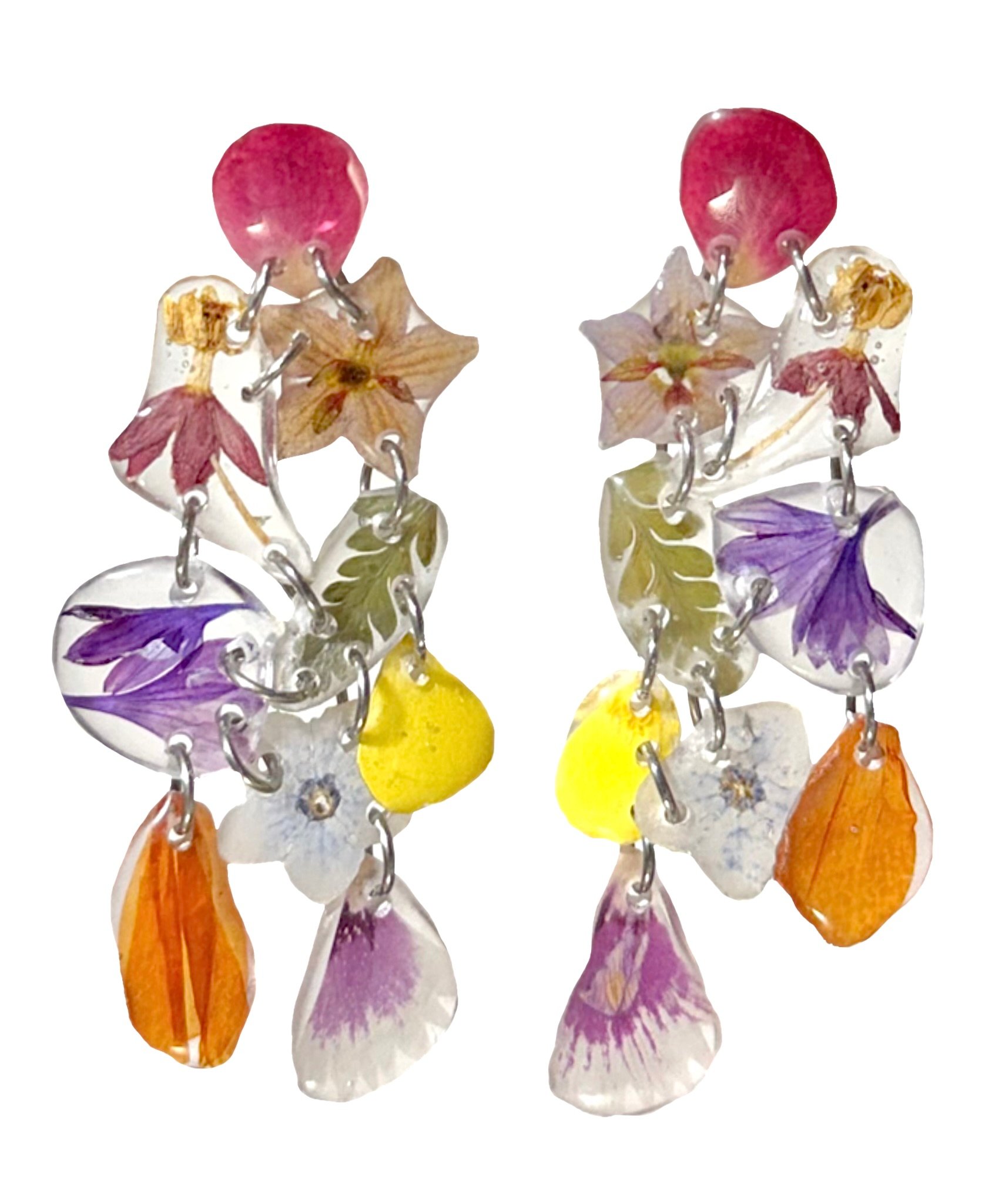 an arrangement of flowers, petals, and foliage from my garden arranged in a unique organic shape. a mishmash of color and whimsy. extremely lightweight despite the size. hardware is silver plated/gold plated stainless steel