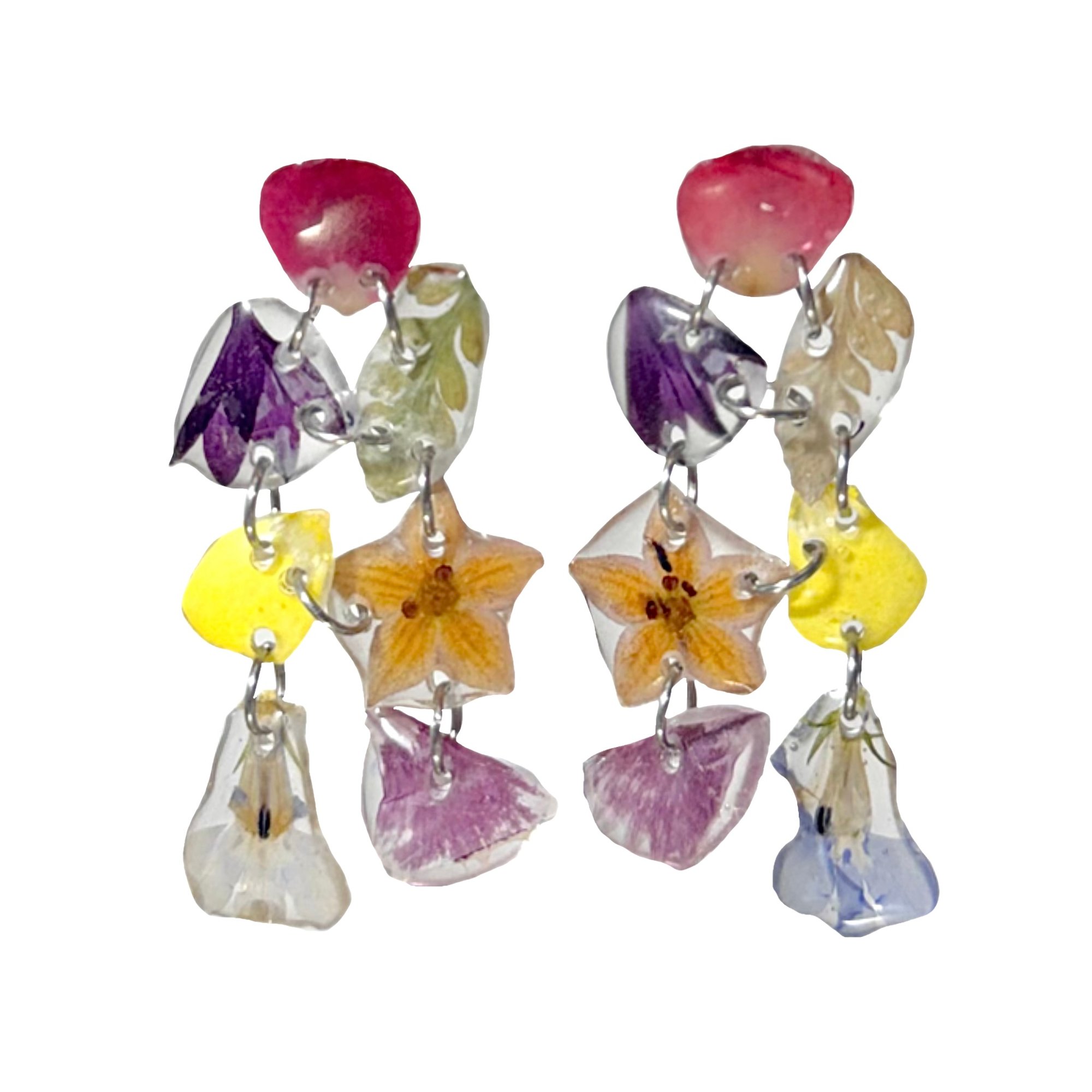 an arrangement of flowers, petals, and foliage from my garden arranged in a unique organic shape. a mishmash of color and whimsy. extremely lightweight despite the size. hardware is silver plated/gold plated stainless steel