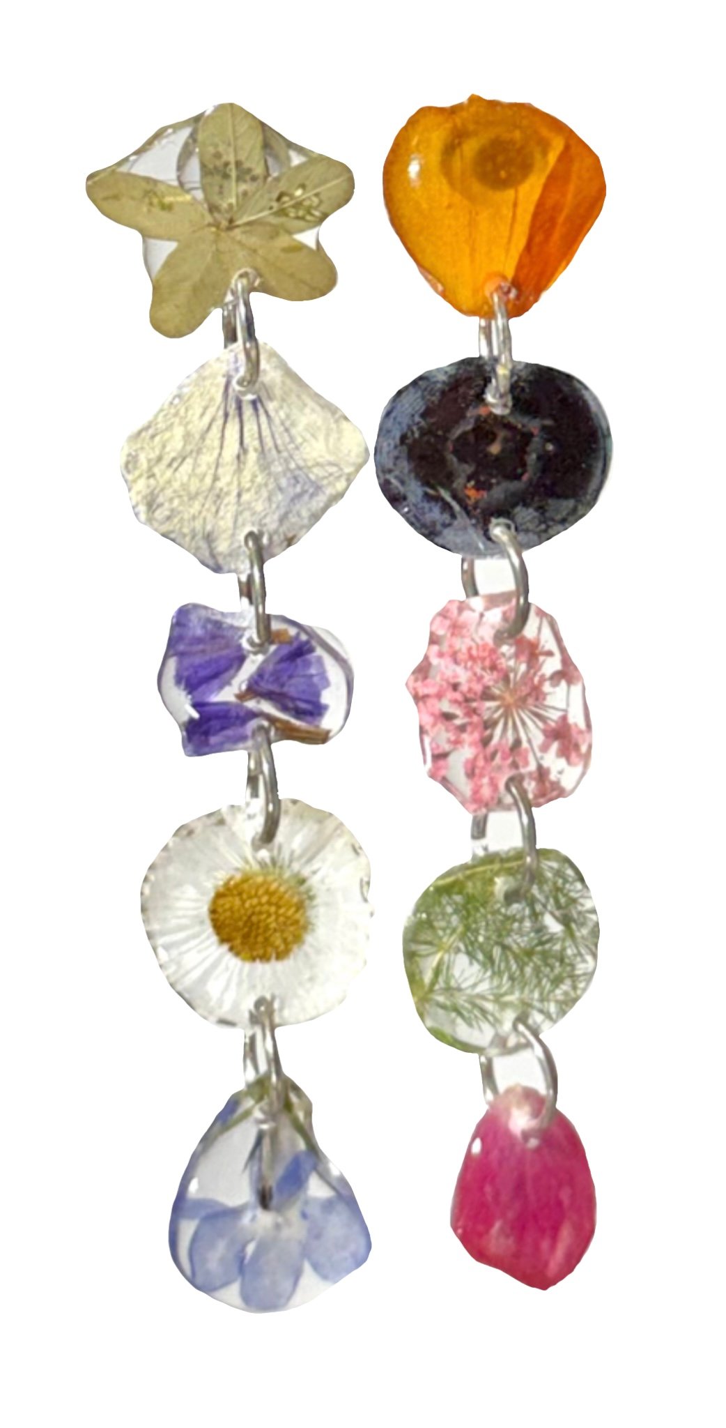 an arrangement of flowers, petals, and foliage from my garden arranged in a straight long drop shape. a mishmash of color and whimsy. extremely lightweight. hardware is silver plated/gold plated stainless steel