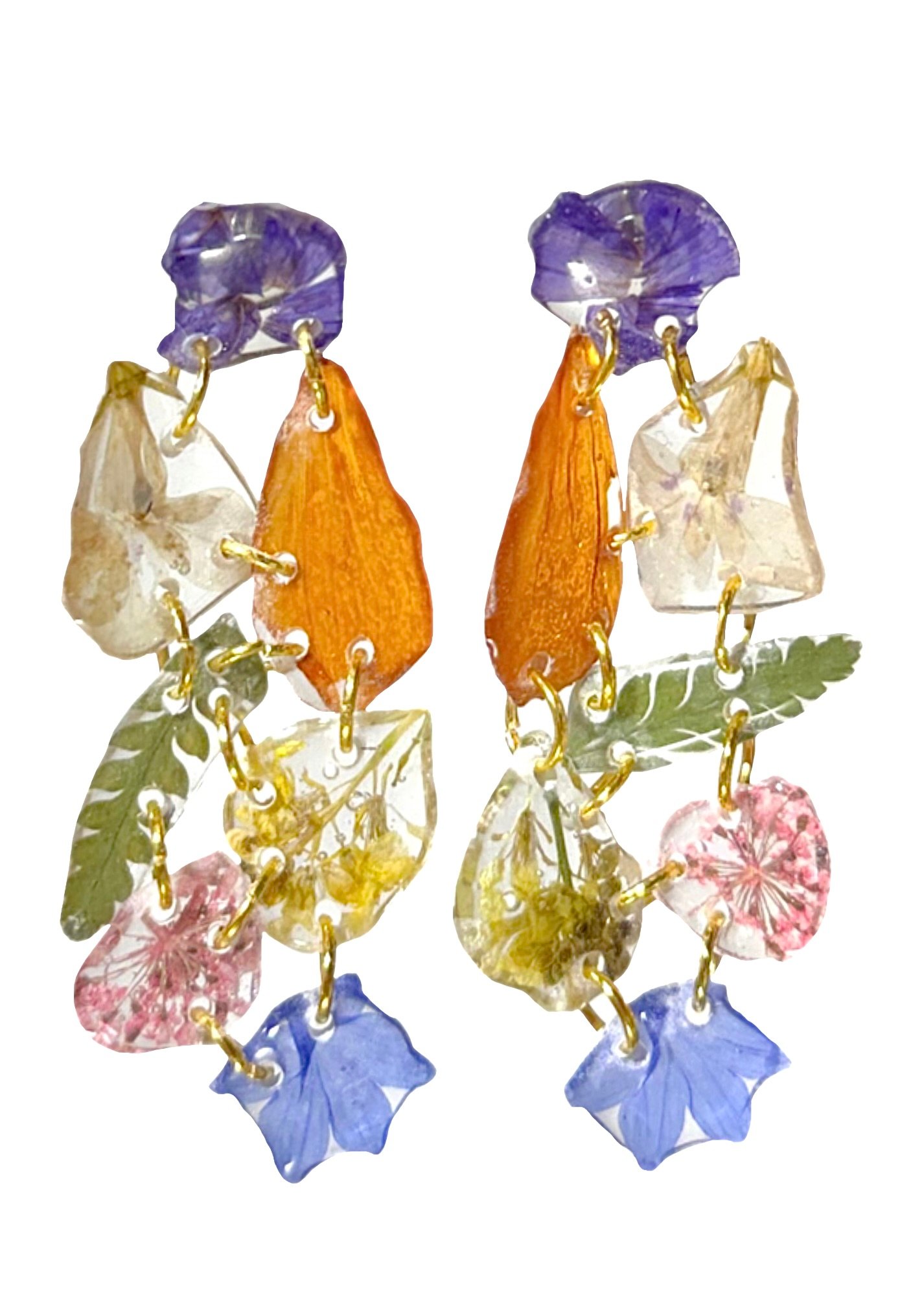 an arrangement of flowers, petals, and foliage from my garden arranged in a unique organic shape. a mishmash of color and whimsy. extremely lightweight despite the size. hardware is silver plated/gold plated stainless steel